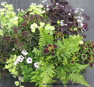 Foliage is just as important as color in creating a successful container planting. Once you've gathered a group of candidates, think about the size of the leaves and their surface texture. Leaf textures range from waxy (ivy geraniums) to shiny (croton), to prickly (asparagus fern) or velvety (dusty miller). Contrasting foliage really grabs the eye.
