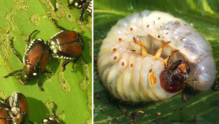 Though attractive with their metallic green and bronze colors they cause a lot of damage in the landscape and garden, devouring leaves and flowers of ornamental and edible plants. Before maturing into beetles they live in the ground as grubs, feeding on plant roots—especially lawn grass.