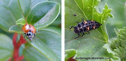 Ladybug larva, right, are not especially cute, but they are major aphid eaters. Don't squish these good guys.