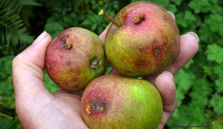 One of the major pests on apples, the codling moth, is found in all areas where apples are grown. It attacks pears, apricots and quinces as well as apples. Small holes are found on the fruit, usually at or near the blossom end. Inside, pinkish-white worms with brown heads feed on the flesh, leaving tunnels full of sawdustlike frass (droppings). The feeding larvae inside the developing fruit often causes fruits to drop prematurely.