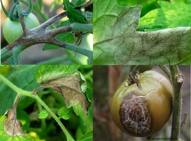 Early symptoms of late blight infection include irregular olive or gray water-soaked lesions on the leaves and stems of tomatoes and potatoes. Both crops are vulnerable to this fungal disease at every stage of their growth cycle. A mildew-like white mold may also develop on or near these lesions. The disease spreads rapidly and can kill crops within a week of infection. (Late blight fungus, Phytophthora infestans, was the cause of the potato famine in Ireland in the 1850s.)