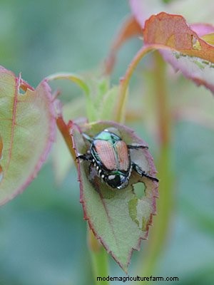 A Japanese beetle, feasting on tender, new leaves of a rose bush. Photo: David Grist