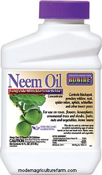 Neem oil comes from a tree; when sprayed on plants, it reduces feeding. Scientists call it an antifeedant. Important: neem works best when applications begin at first sign of attack.