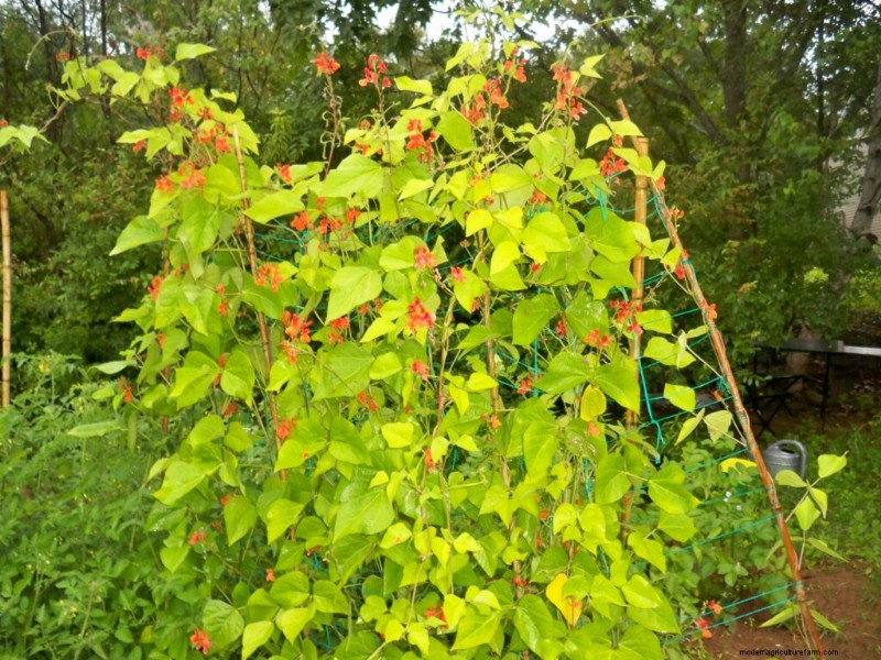 | Use 6' posts, A frame, tepee, or trellis to support pole beans. Alternatively, plant non-rampant pole beans between corn that isn't too densely planted when the corn is 6-8" tall. |