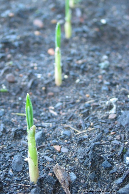 The bulbs’ tips should be placed 2″ below the soil surface (3-4″ for elephant garlic), pointy side up. They can be spaced in rows 4-6″ apart, with rows at least 12-15″ apart.