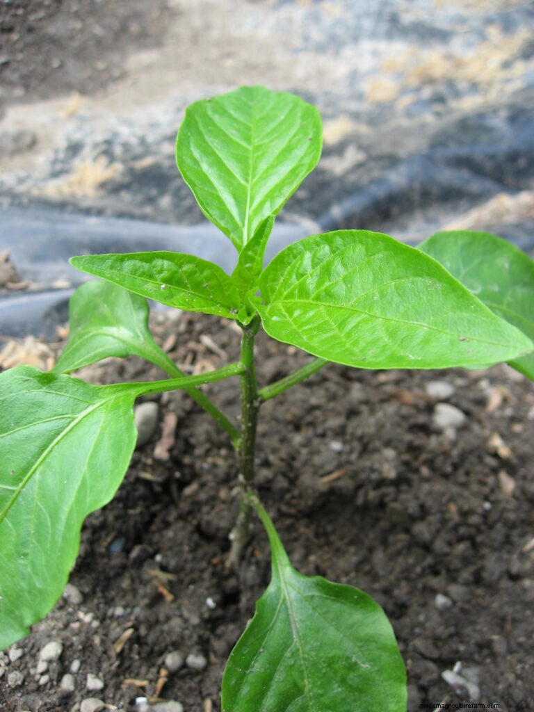 Start peppers indoors about 1 month before the first frost, then set outdoors after the days and nights are warm, otherwise the plants yellow and stop growing if they are exposed to the cold weather. To start indoors, use pots at least 1 1/2″ wide to minimize shock, make a stockier plant, and encourage earlier production. Growers report that the following cold treatment of seedlings significantly improves yields and early growth: (1) When the first leaves appear, lower the soil temperature to 70F and ensure 16 hours of light with grow lamps; (2) when the first true leaf appears, thin seedlings to 2-3 inches apart or transplant to 4″ pots; (3) when the third true leaf appears, move the plants to a location with night temperatures of 53-55F; keep there for 4 weeks; (4) return the seeding to a location with an average temperature of 70F; (5) transplant into the garden 2-3 weeks after all danger of frost has passed. Soil temperature should be at least 55-60F for transplanting, or the plant may turn yellow, become stunted, and are slow to bear. Some recommended feeding seedlings weekly with half-strength liquid fertilizer until transplanted.