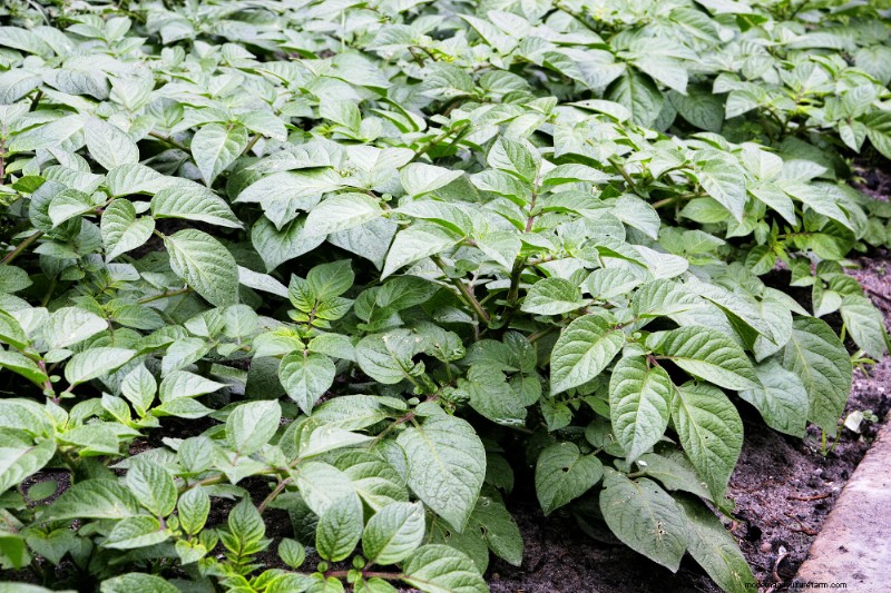 Keep weeds out of the potato patch with a very light cultivation, or use straw or leaf compost mulch. Gradually hoe soil toward the base of the potato plants, to prevent the roots from becoming sunburned. A second application of fertilizer is usually made 1 month after planting by side dressing in the row. Potatoes are almost 3/4 water, soil moisture is very important. Potatoes need about 1-2″ of water every week. Keep the soil evenly moist, and try not to let the soil completely dry out as this will cause sudden re-growth when watered, giving the tubers ears and noses, splits, or hollow heart. Let the water soak down to about 10-12″ each time. Cover plants if a hard frost is expected.