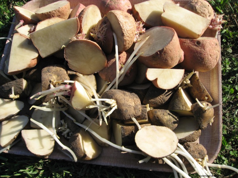 Tubers the size of a medium egg may be planted whole, cut larger tubers with a clean sharp knife so that each piece will contain 1 or more eyes. Pieces should be cut with plenty of flesh around the eyes, as the plant will utilize this stored food during the first few weeks of growth. Seed potatoes may be planted immediately after cutting if soil moisture is properly controlled; if there is a chance the soil will be too wet, allow the cut pieces to dry out a couple of days prior to planting, shriveling is to be avoided at all costs.