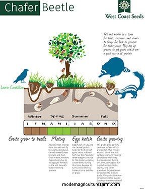 In the larval stage, the chafer can cause some damage to lawns resulting in brown patches. But because they are so substantial, they make an ideal source of protein for birds and mammals. The grubs are at their largest (and most appetizing) exactly when local wildlife is preparing for spring nesting and breeding. It’s the crows, skunks, and raccoons that cause most of the damage to lawns as they search out these succulent morsels.