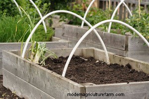 By building a separate frame out of 2×2” beams, the same dimensions as your raised bed, and stapling clear plastic onto it, you can create an instant cold frame, which is perfect for germinating seeds earlier in the spring. This same frame can also have mesh screen attached in order to keep birds, cats, or other animals out of the boxes. Lightweight row cover will offer protection from insects if used in the same way, and heavyweight row cover can be used to protect plants from frost. The same frame can be adapted to hold black plastic in place when the beds are not in use, which will prevent weed seeds from germinating, and shade cloth can be used in the summer to slow the bolting of lettuce and spinach plants.