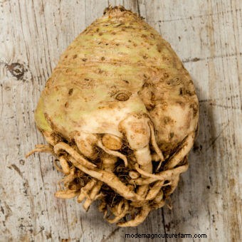 Celeriac is grown as a root vegetable to the size of a grapefruit—about 12cm (5”) in diameter — though much of the “bulb” grows above ground. The benefit of celeriac over other root vegetables is that it contains hardly any starch. The roots can be stored for as long as four months if kept cool and humid so they don’t dry out. The edible portion of celeriac is not a root, but a hypocotyl — an organ in which the plant can store food for the following year.
