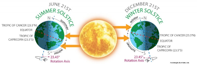 The wobble in the Earth’s axis is exactly 23.45°. Summer solstice is the longest day of the year in the northern hemisphere, so the wobble has reached its turning point. After this time, the days will gradually begin getting shorter again. Thankfully, it’s hardly noticeable until around the end of summer. The line of latitude around the Earth that is 23.45° north of the equator is the Tropic of Cancer. The latitude 23.45° south of the equator is the Tropic of Capricorn. This is the point nearest the sun on our winter solstice – the shortest day of the year for us at the north. Not surprisingly, the area between the two tropical lines are known as… the tropics.