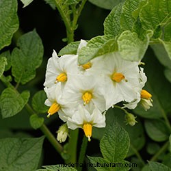 Potato plants are perennial members of the nightshade family, Solanaceae, and close cousins to tomatoes, peppers, eggplants, and tobacco. This is evidenced most obviously by the structure of the flowers on each plant — though potatoes themselves may have pink, white, blue, or even red flowers. All Solanum flowers have yellow stamens.