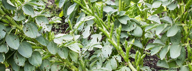 Growing: Keep overwintered plants weeded. Provide stakes or strings between the rows to stop plants from falling over. When black aphids appear in May/June, pinch off the growing tips on which the aphids feed. Spray with blasts of water to dislodge the aphids.