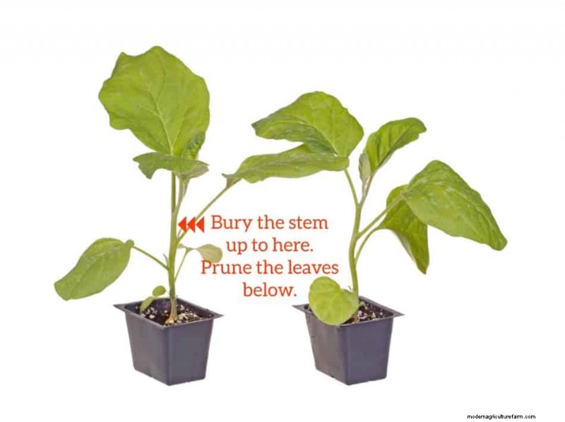 When transplanting eggplants, burying their stems will help the plant develop a stronger root system. Plants from the nightshade family, like eggplants, tomatoes, and peppers send root growth from their stems. Prune the lower leaves and bury up to two-thirds of the stem, close to the top growth.