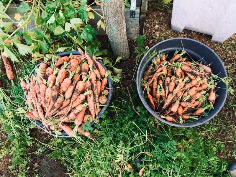 To store them, use any spare deep containers, bins or buckets you have at hand. Lay sawdust or sand on the bottom, then a layer of carrots horizontally, cover them with sawdust or sand again and repeat the process until the container is full. Water the sawdust or sand in between and make sure to use a lid so that the water doesn’t evaporate.