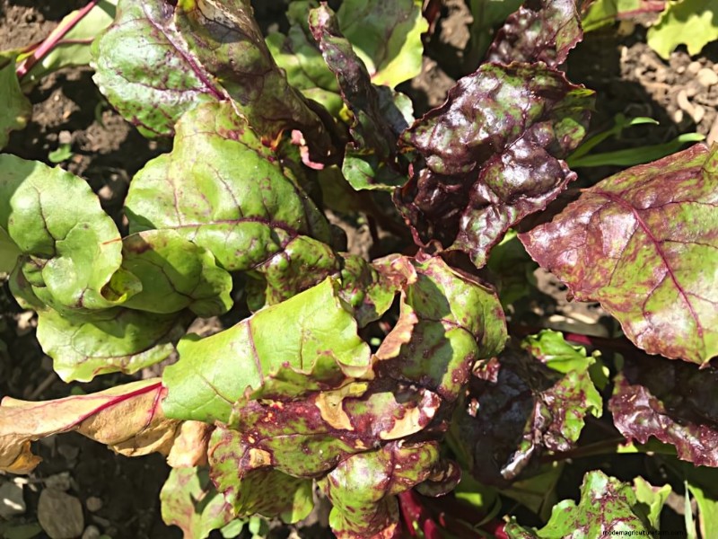 Leaves that shrivel up and change color to a reddish tint are often a sign of aphids, green or black, especially in annuals like beets or perennials like black or red currant. Here’s an example of the damage: