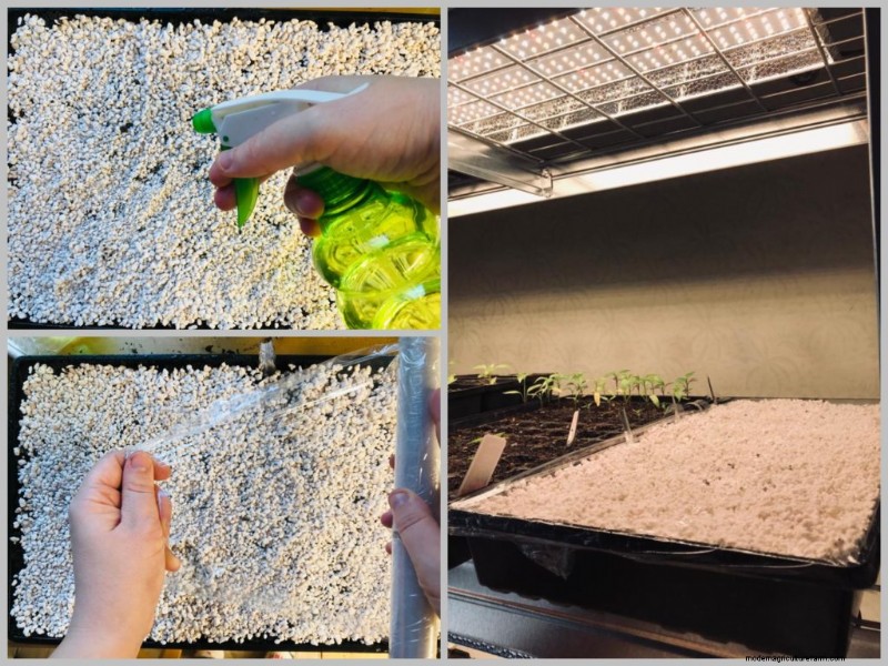 This does two things: it traps some moisture in and stops the seeds from sticking to the plastic wrap (if that’s what you’re using). Don’t worry if the perlite turns yellow, it’s because of the regular misting from the top. Spray the perlite thoroughly with water.