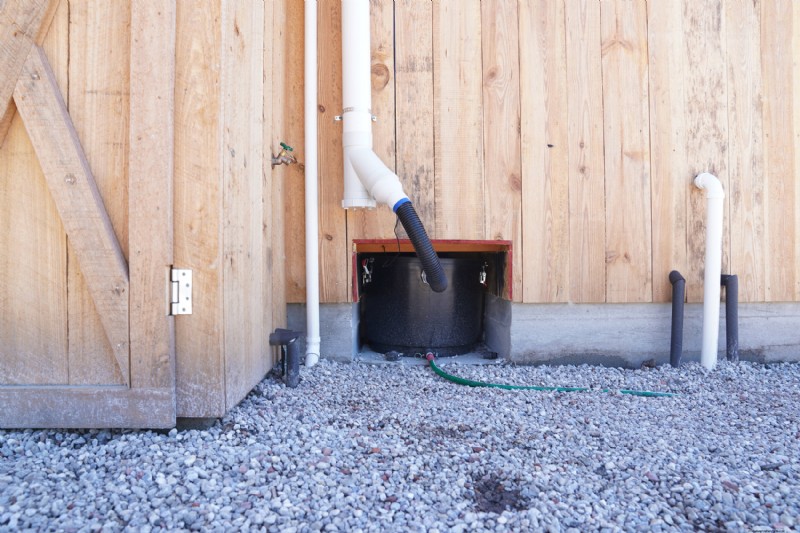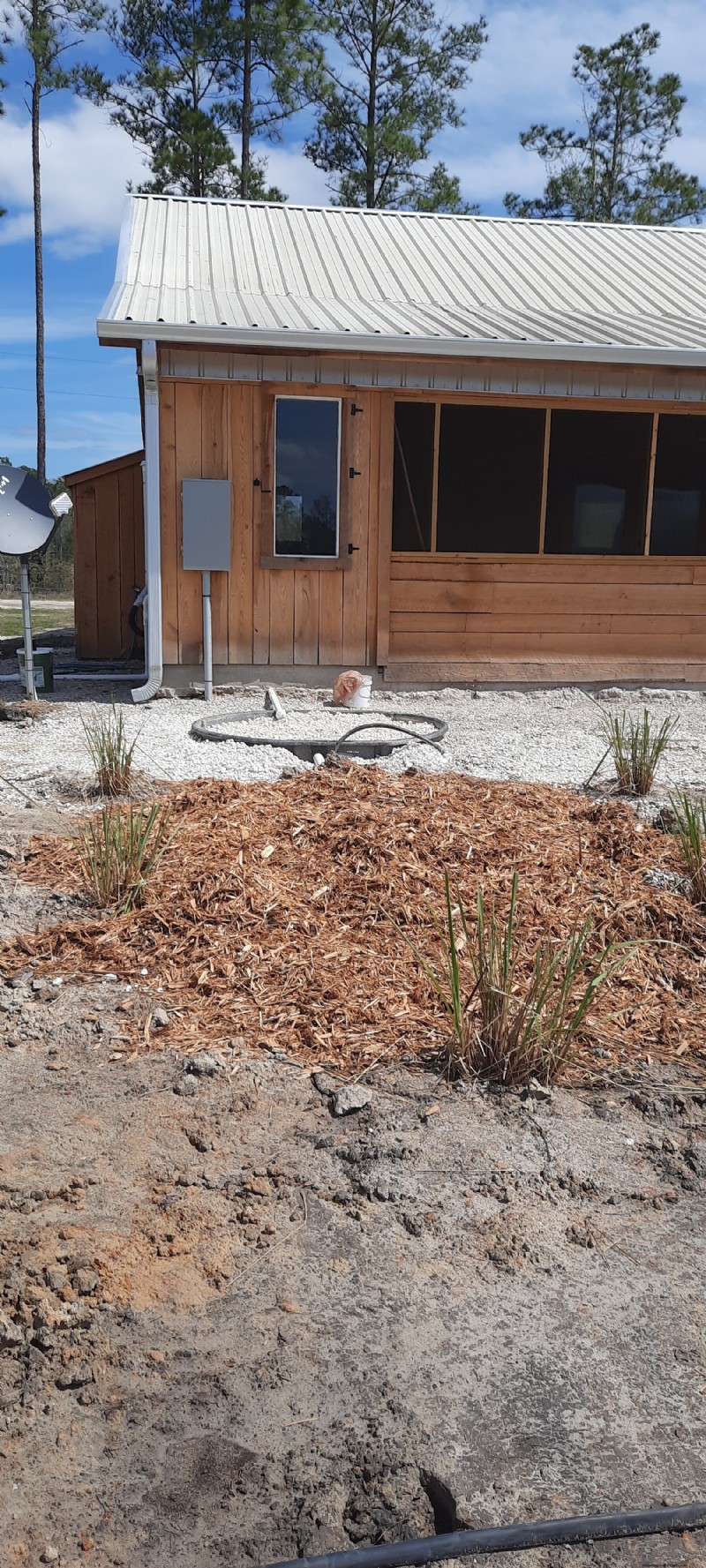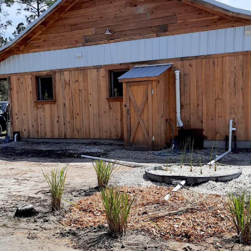 There are two reed beds attached to the climate cabin, composed of a pair of catch basins (big round tubs) that hold 300 gallons each, which have been sunk into the ground just above grade. Both tubs are filled with rocks made of reclaimed concrete and brick as well as seven reeds — hollow-stemmed, water loving plants placed on one foot centers. Each tub is connected to a different water outlet from the house with piping and hose, and both overflow into a mulch pit surrounded by water-loving plants.