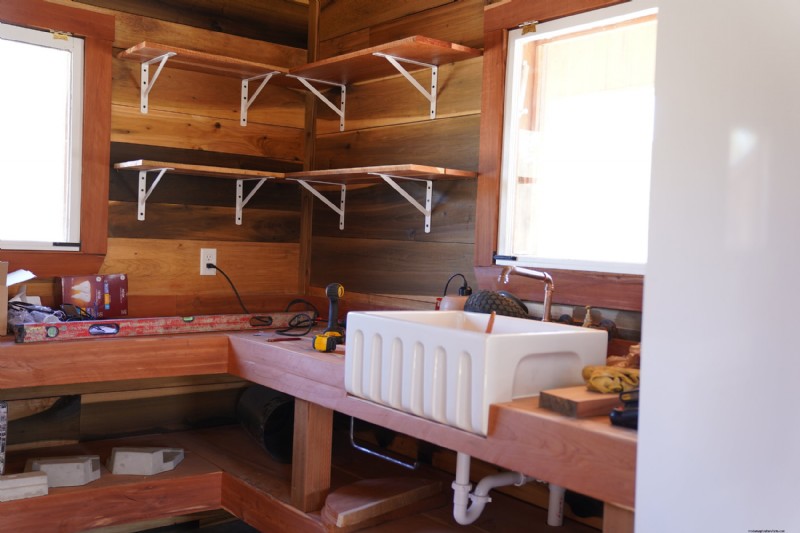 The third set of shelving is in the kitchen. There is one large counter with a shelf underneath that spans the whole northeast and northern side of the house. The counter is obviously for food prep and the storage underneath for pots, pans and cooking supplies. We are waiting to install our range hood before we install the wall shelving which will be used for our plates, bowls and cups as well as a pantry for dry food storage.
