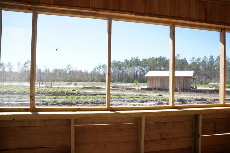 The porch is one of my favorite spaces in the Climate Cabin! From inside, you have a nice view of the farm, the pond and the Okefenokee wilderness. It faces west, so we will get awesome views of the evening sunsets as well.