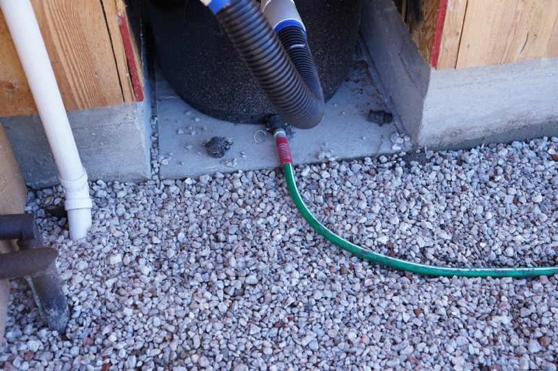 Another feature of the Green Loo that we liked was its hole designed for leachate, which will come from urine as well as the bidet we’re using to cut down on toilet paper usage. Since this is a dry composting toilet, the leachate should be only a trickle, if there’s any at all. As a result, the piping system is not as elaborate as our graywater pipes — it’s just an old garden connecting the bottom of the chamber and the farthest edge of the reed bed. Once in the reed bed, it has to travel the greatest distance to reach the next overflow, ensuring proper exposure to cleansing reeds.