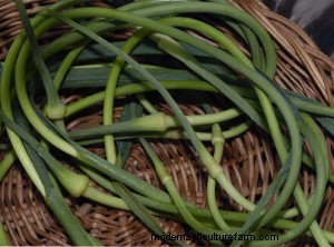 Now, depending on the type of garlic that you are growing, harvest the garlic scapes. These are the long shoots growing up from the middle of the leaves. The leaves are going to look like giant blades of grass, while the scapes will be round. You’ll know it’s time to harvest the scapes when they curl over. To harvest, pull the scape upwards slowly but firmly. You’ll want to pull the scape completely free without pulling the garlic out of the ground. (That comes later!)