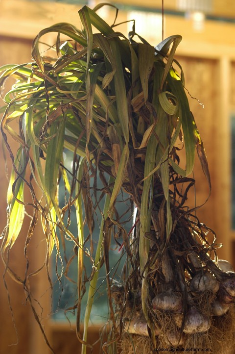 Place each dug-up plant–with the roots and leaves still attached to the garlic bulb–in a pyramid formation. (Instead of going out for football, they should really consider cheerleading.) There should be space between the bulbs on each row. Now, tie up your garlic and hang it out to dry.