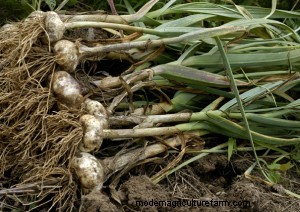 When early summer arrives, but later than the Fourth of July -for the Mid-Atlantic it will be time to harvest your garlic. When garlic is ready, there will typically be only six leaves left on the plant. Get your pitchfork and dig about three inches in front of the stem. You’ll want to give your garlic a nice, wide berth. After all this work, it would be a shame to impale your plants!