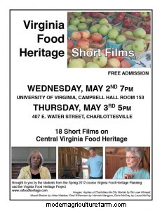 Join us for the World Premiere of the first Virginia Food Heritage Short Films. These 18 short films on Central Virginia food traditions will be screening in Charlottesville on both Wednesday, May 2nd, at 7pm, and Thursday, May 3rd, at 5pm, with a discussion to follow the screening on Thursday.
