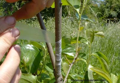 However, cicadas already had laid eggs in some branches of most of these trees, and in the trunk of one unfortunate little pear tree that we’ve had for a couple of years. So I bound that half-inch-wide trunk, and many of the affected branches of our other young trees, in sealing/ grafting film.