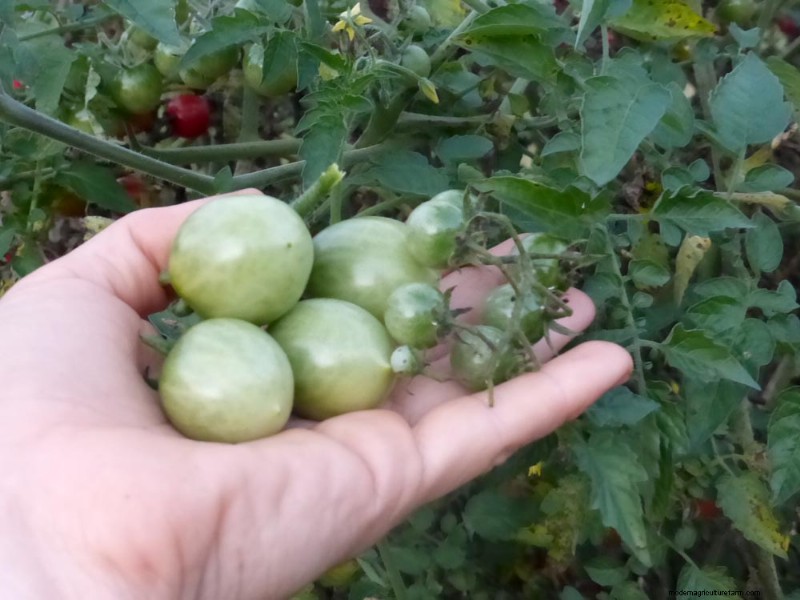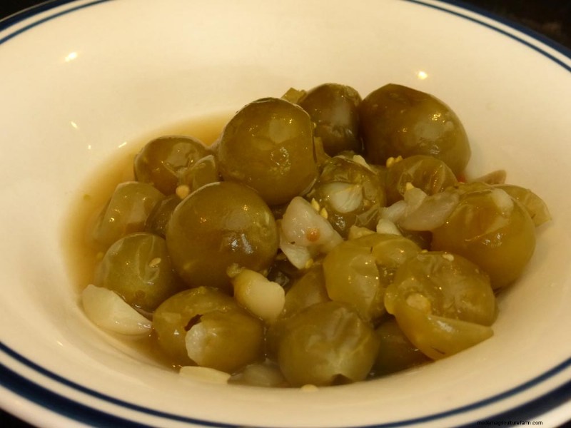 Here’s our recipe, scaled down for family use: Wash and de-stem about a gallon of green cherry tomatoes that are at least half of full size. Throw in a handful of peeled garlic cloves, a couple hot peppers, and a heaping spoonful each of coriander, dill seed, and dill leaf. Cover with a brine made of about 8 tablespoons of salt and 8 cups of water, and then with a weight to hold the tomatoes under the water. (A food-grade plastic bag half-full of brine can make a good weight.) Tie a cloth over the top of the container to keep flies out, and let it sit at room temperature until the tomatoes are as soft as olives. Then put replace the cloth with a lid and put it in the fridge for long-term storage and eating.
