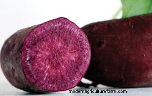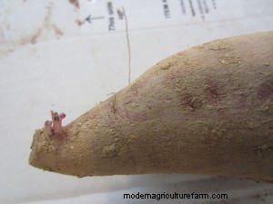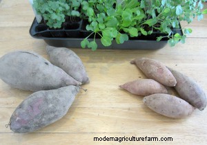 The ideal size for a slip producing sweet potato is about two inches in diameter. In the photo to the right there are some Violettas, a purple sweet potato with white flesh grown at Living Energy Farm. The large eating ones are on the left, and the smaller ones for slip production on the right. We select our seed stock right in the field after harvest, but you can pick them out now from the roots you’ve been storing. In my kitchen, I find smaller ones left this time of year anyway, because it’s hard not to eat all those big taters first.
