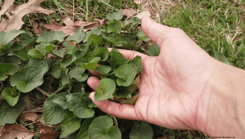 I commonly use my hands like a violet-leaf-harvesting comb, working my fingers beneath the leaves, clenching them together, and twisting to wrest the lovely leaves from the stems. In the height of spring, and again as the fall rains return, you can easily collect leaves by the basketful.