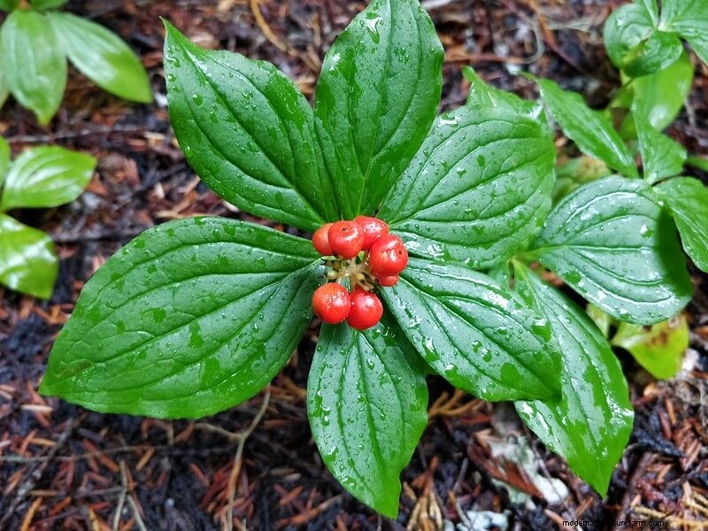 Bunchberries have a mildly sweet flavor, but are more mealy than anything else. In the fall, the leaves turn from green to red to deep purple and dot the landscape with gorgeous colors. The red berries complement the purple leaves.