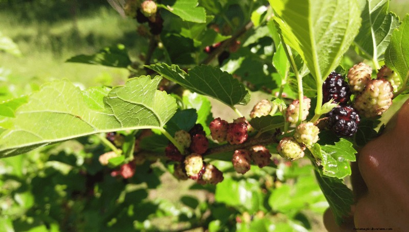 Mulberries can be juiced, cooked into syrup, fermented or cooked into finger-staining chutneys, and pretty much used any way you would use any other berry. Some folks make a big deal about the little stems that stay stubbornly attached. I see it as a nonissue and don’t notice them. The fact that mulberries lack the hard-crunching seeds of other fruits like blackberries more than makes up for it. If they do bug you, though, cook down the fruit and send it through a food mill. That should clean it up nicely enough for your purposes.