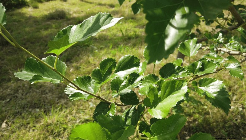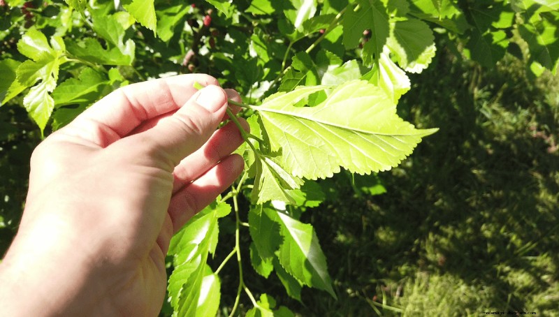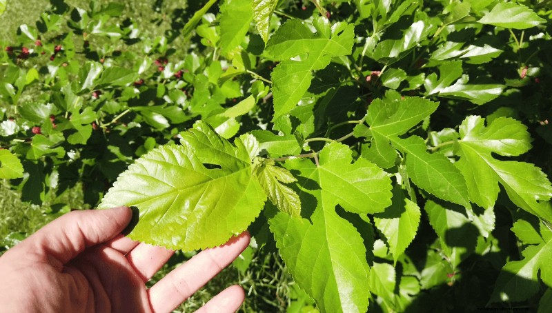 Mulberry trees have quite edible leaves. The young, green-branched shoots of spring are tender for a choice meal, but any leaf can be used. They’re tasty, don’t have any bitter flavor, and are abundantly available through the tree’s growing season. Both raw or cooked, you can use them as you would any other tender, enjoyable green. If eating raw, however, try to pick the youngest, most tender, bright-green leaves you can. Leaves that have fully matured may leave you chewing for longer than you want.