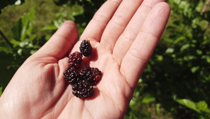 Though I see no need to hurry through a berry picking session, you can speed up the process by setting down a tarp and giving the branches a good shake. The ripe berries will rain down, usually with a helping of stink bugs and ants. Thankfully, mulberries float, making cleaning your wild haul a bit easier.