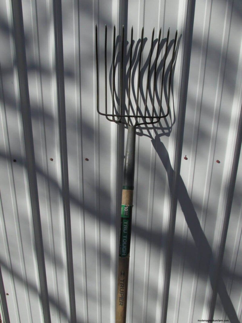 My pitchfork is vital to cleaning out animal houses. All that soiled bedding is worth its weight in gold to me, and the many-tined pitchfork I’ve photographed here does a great job of scooping it cleanly. That manure and old straw isn’t waste, of course. It’s magnificent, soil-improving mulch. If you are hard at work improving your garden soil, or mulching it with care, then pitchforks like these are excellent for layering mulch, manure, and leaves over a garden bed.