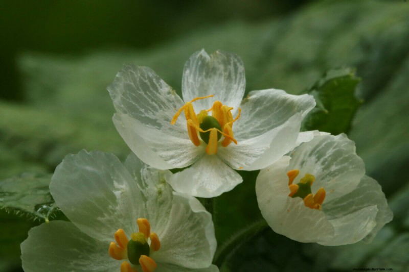 This rare flower first makes its appearance in the early spring as the leaves, initially folded up, slowly unfurl. The flower then appears, a delicate, white bloom that becomes translucent when wet. When they dry up, the flowers turn to a faded white while the plant prepares itself for its fall show of reddish seed stalks covered in clusters of bright blue berries (they do look something like blueberries).