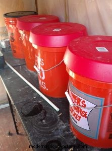 Your original Day 1 bucket with the black lid is finally ready to go out to the chickens! It should be at the end of the row with three “red lid” buckets to its left. Stir it up well and serve.