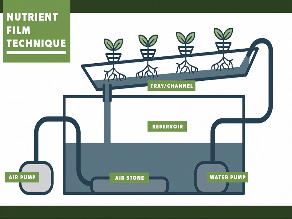 A water pump propels nutritious water from a reservoir into the channels. As a result, a thin layer or film of this nutrient travels through every channel, supplying nutrients to each plant.