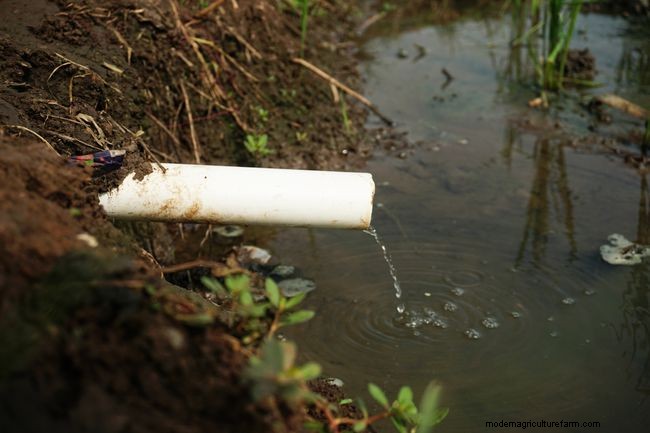 Most drainage pipes are no longer made from clay piping but from polyethylene tubing; the word “tile” or “tiling” is a holdover from the materials and design previously employed. The artificial pipes are placed at a slope just below the crop root area. Through perforations in the pipe, excess water enters and can then be directed into a ditch or other means of conveying water away from the field.