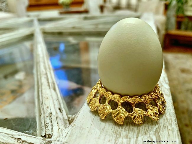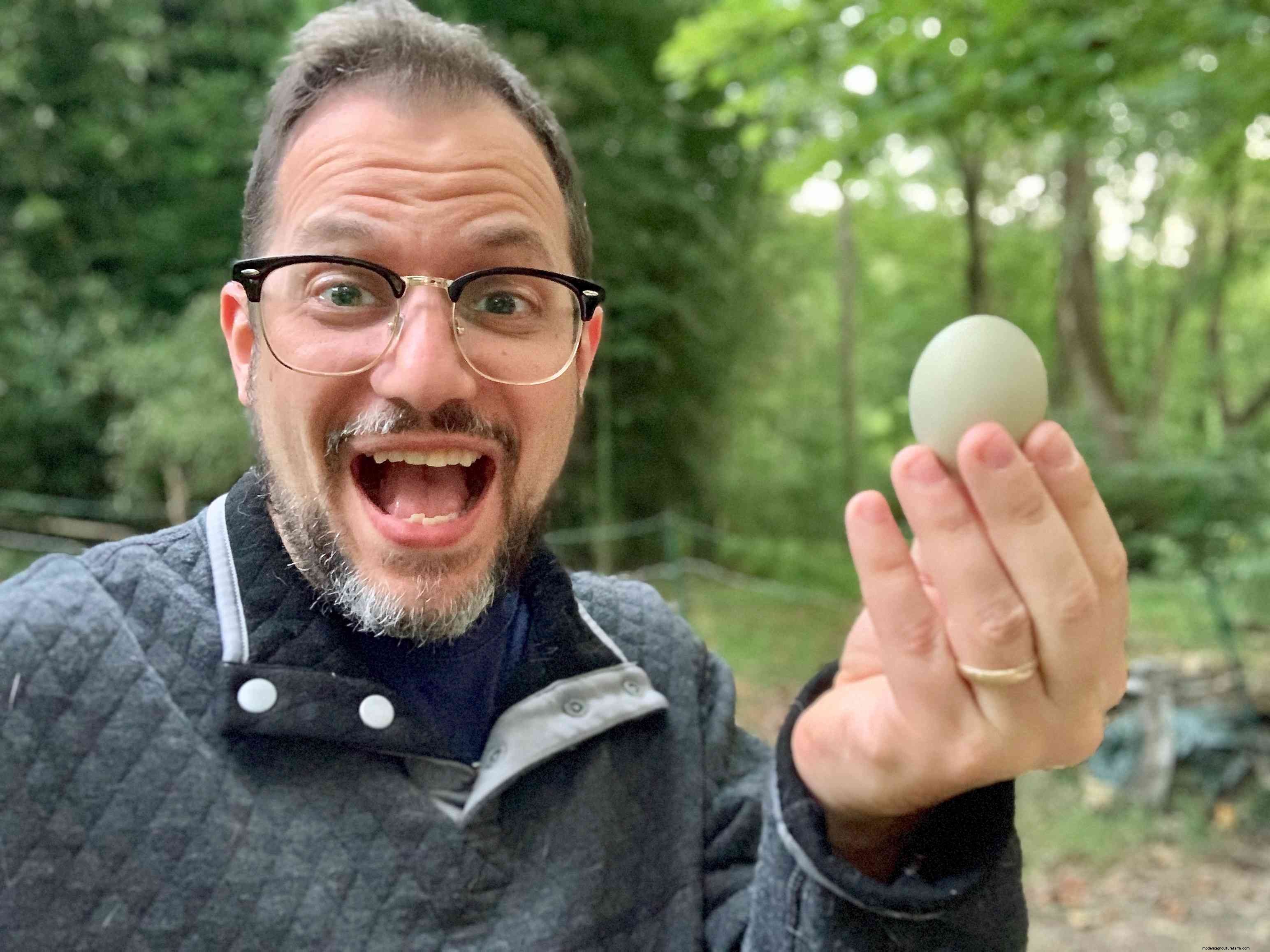 After spending a couple of hours with her, we went inside to go on with our day. After all, a watched egg never hatches. (Or something like that.) As the sun began to set, we walked back outside to the chicken yard to check in on the gang and to see if Terry had left us a present. Lo and behold, there it was — right inside the nesting boxes, just beside the decoy eggs, Terry had laid her very first egg. She's an Easter Egger, which means her eggs will be colored. The one in the box was green with an olive hue. It was beautiful.