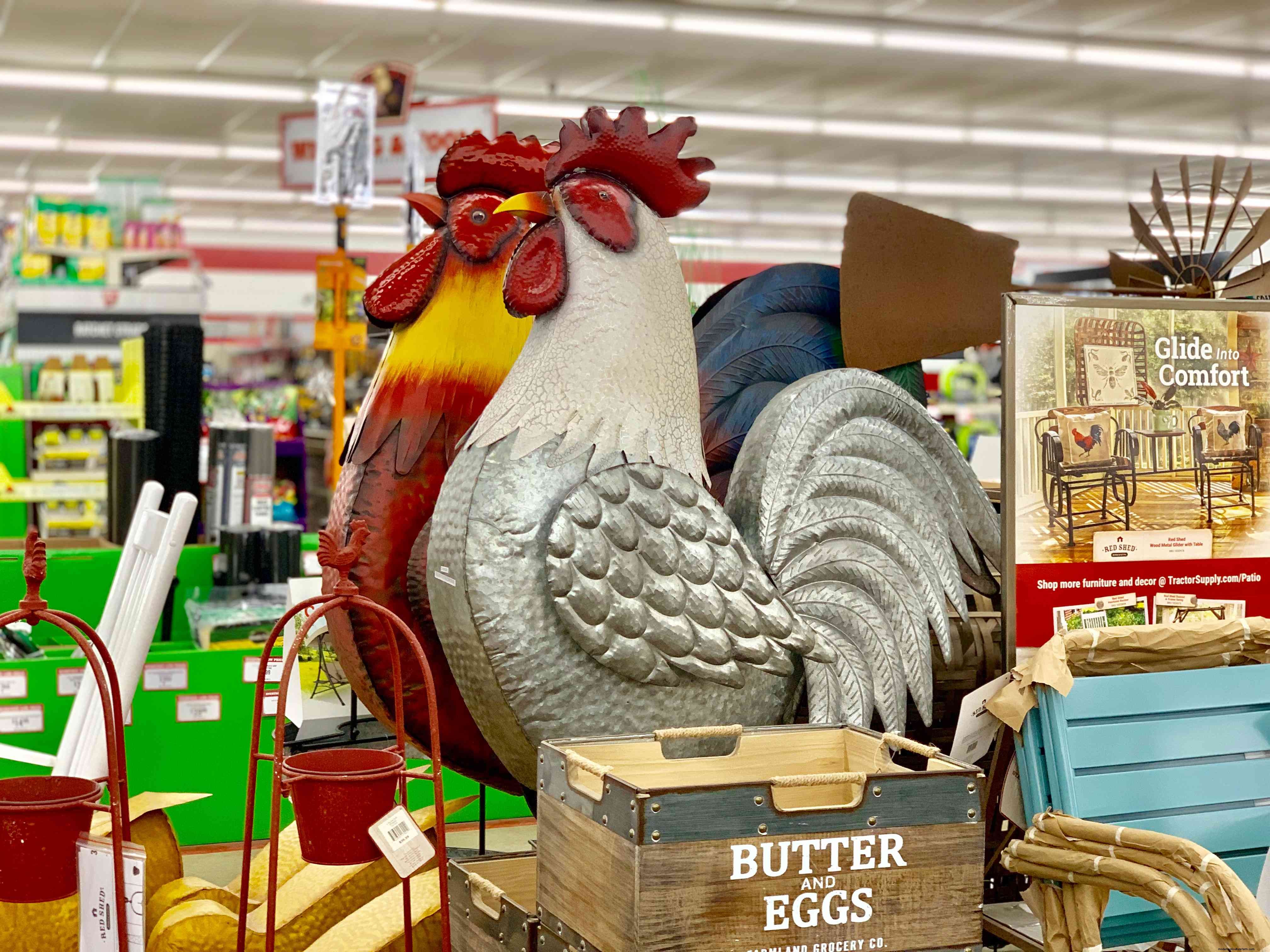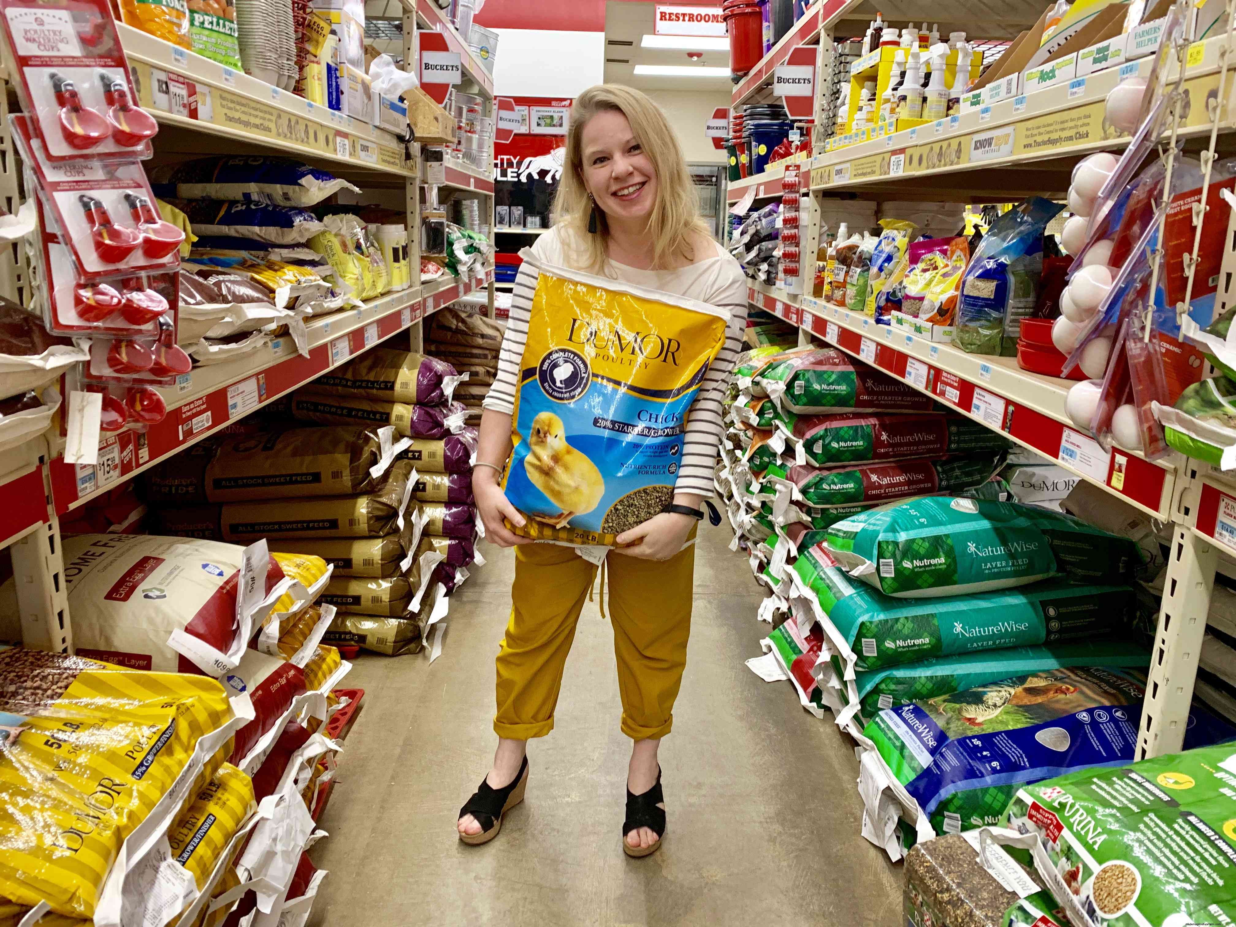 And now we're getting prepared for the chicks' arrival. We'll be getting seven baby girls. Until they're old enough to move outside for the free-range mountain life we have planned for them, they'll be spending their first six to eight weeks at the Cohen Homestead living in a coop in our garage. We need supplies: chicken food, a warming plate, a water bottle with a nipple. We've started to shop at a store called Tractor Supply Company on a regular basis. It's the perfect big box retailer for rural life.