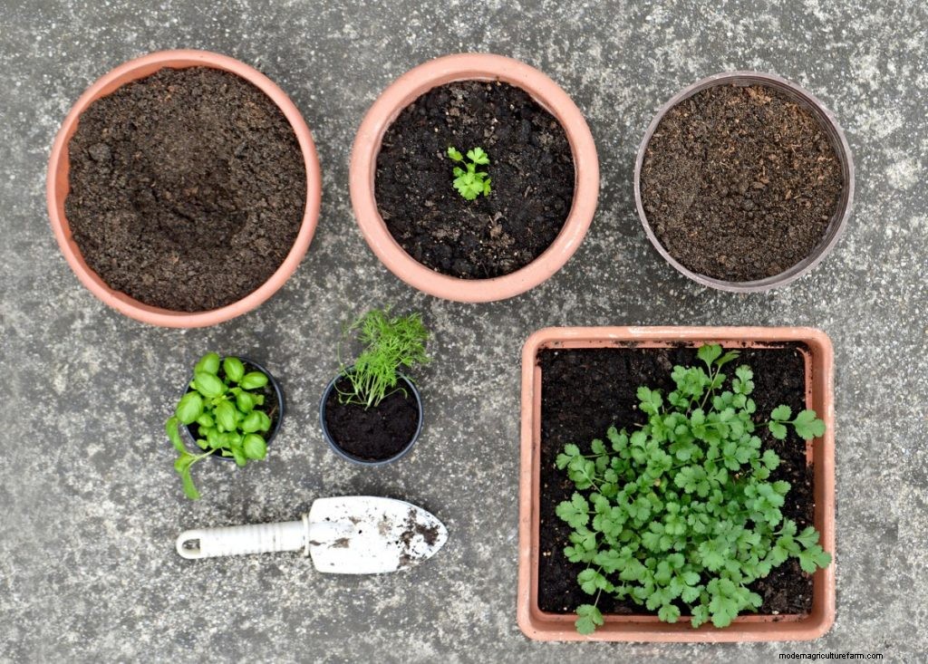 You should have all of the supplies that we discussed earlier. So now all you need to do is add soil to your pots as well as herb seeds or seedlings.