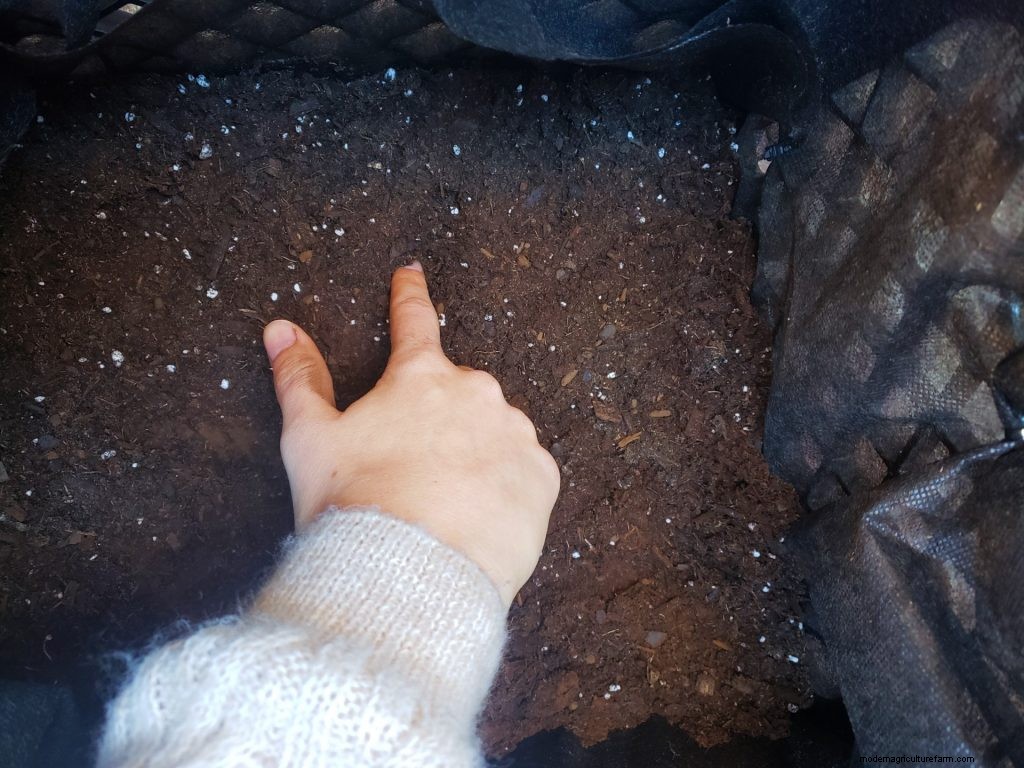 7. Using your hand or a small trowel, dig holes in the soil to plant your seeds or seedlings in. Follow instructions on seed packets for recommended depth and spacing. Fill the hole and pat it down to ensure good contact with the seed or roots.