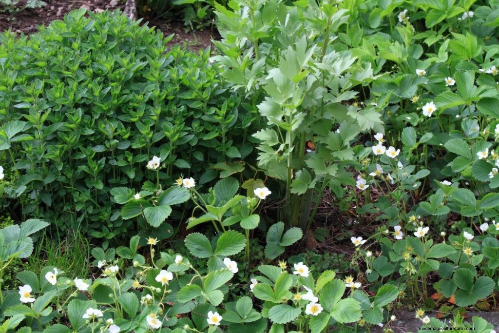 Besides providing perennial salad and vegetable crops, one of the main functions of the lower level plants is to create a living mulch of ground covering plants.