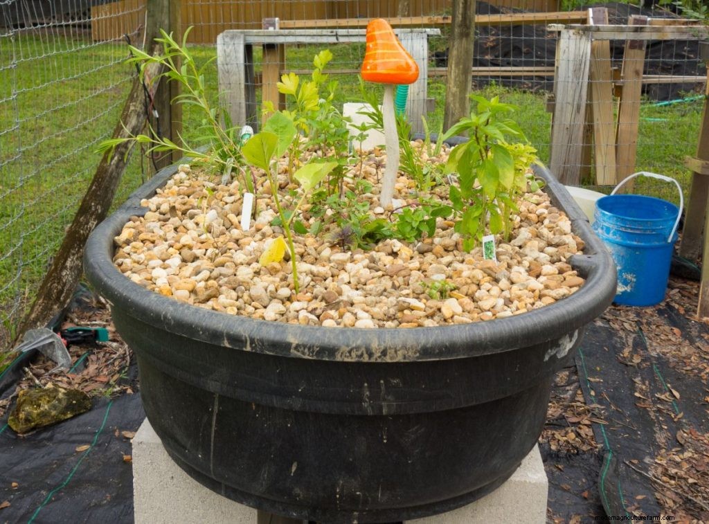 All the waste from the fish tank breaks down within the plant bed, and the filtered water drains back to the fish tank.