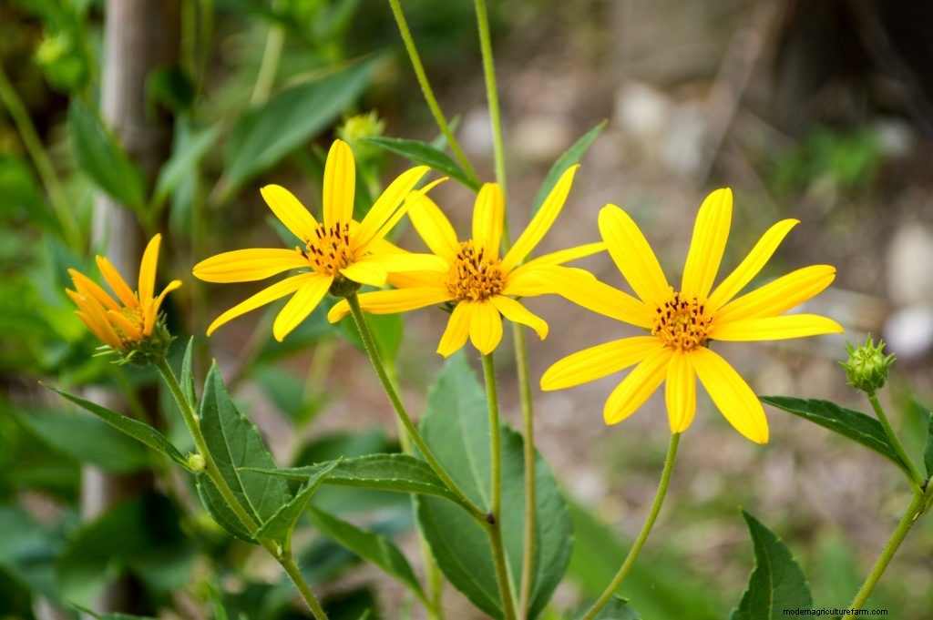 They grow tall like a sunflower, with a pretty little yellow flower on top. Sunchokes also produce tasty edible tubers that resemble ginger and store well over winter.